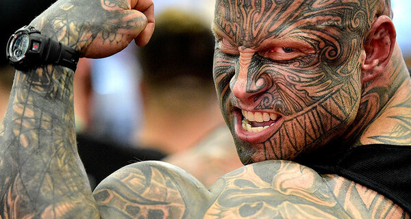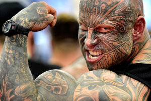 Bodybuilder Jens Dalsgaard from Denmark shows his muscles to visitors at the FIBO Power, a bodybuilding fair in Cologne, Germany, Thursday.
