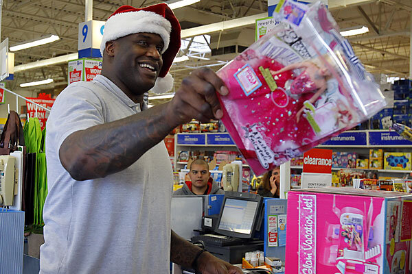 Boston Celtics Shaquille O'Neal checks out Nov. 14 after shopping in Framingham, Mass., for toys for the Boston area Toys for Tots program. On Saturday, a local thief apparently made off with $15,000 worth of the toys that had been collected. But officials are again accepting donations, which are pouring in.