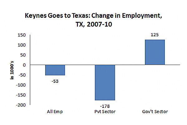 Now, this was a period when the nation lost close to eight million jobs, so this churning in Texas is a very small drop in that bucket. But it sure doesn’t match the Governor’s anti-government rhetoric.