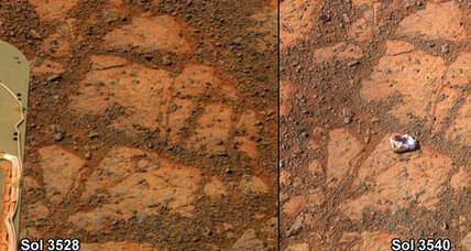 • A "jelly doughnut" of a rock that appeared apparently out of nowhere, just days ago: "We think that in the process of [dragging a stuck wheel] across the ground – and this is speculation at this point – that we flicked it, that we kind of tiddly-winked it out of the ground," says Dr. Squyres. "It appears that it may have flipped itself upside down. If that's the case, we're seeing the underside of the rock … that hasn't seen the Martian atmosphere perhaps for billions of years…. We're still working this out. We're making measurements right now. So this ongoing story of discovery – Mars keeps throwing stuff at us, and it's these kinds of unexpected discoveries that make this mission continue to be exciting."