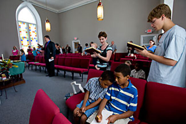 Revived: Congregants sing at the Capstone Baptist Church in North Bennington, Vt. It was built as a Presbyterian edifice in 1834, to serve the many Scots who worked at a local mill. -