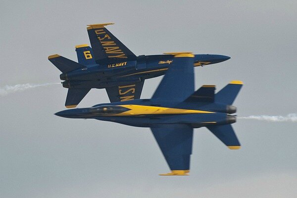 A typical Blue Angels show includes four F/A-18 Hornet tactical jet aircraft flown in close formation – as close as 18 inches apart – plus two solo aircraft. The lowest maneuver – called a “sneak pass” – is flown by one of the solo aircraft just 50 feet off the deck.