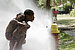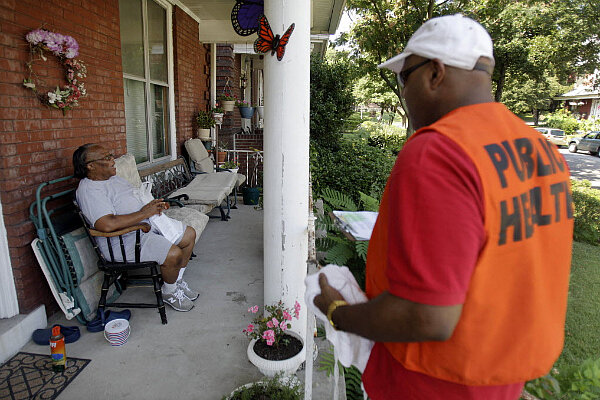 Sam Anderson, with the City of St. Louis, talks to Ophelia Stallings as she sits on her front porch Friday in St. Louis. Anderson and others from the city and the United Way spent the morning checking on the elderly as a heat wave blankets much of the United States.