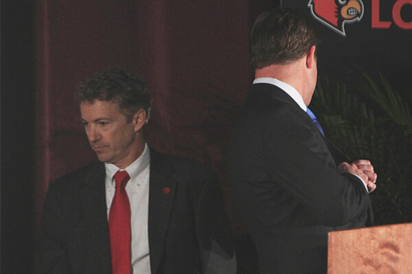 Republican US Senate candidate Rand Paul (l.) refused to shake the hand of Democratic opponent Jack Conway (r.) after Conway made comments about the alleged 'Aqua Buddha' prank during their debate at the University of Louisville in Kentucky Sunday. - About video ads