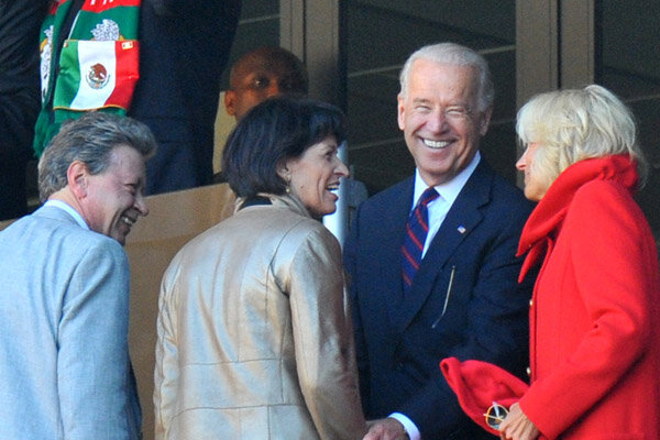 US Vice President Joe Biden (2ndR) and his wife Jill (R) talk with Swiss President Doris Leuthard (3rdR) during the opening ceremony of the 2010 World Cup football tournament on June 11, 2010 at Soccer City stadium in Soweto, suburban Johannesburg. Vice President Biden said the US will beat Britain in their opening World Cup match Saturday. - About video ads