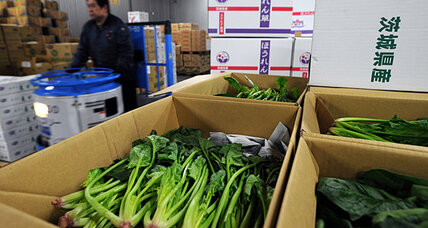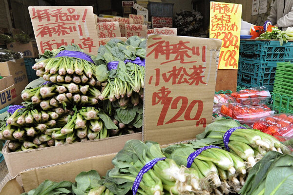 Spinach from Kanagawa prefecture, left rear, and other leaf vegetables are on sale at a greengrocery in Tokyo on Wednesday March 23, 2011. Traces of radiation from the Fukushima Daiichi nuclear complex in northeastern Japan are being found in vegetables and raw milk from a swath of farmland, forcing a government ban on sales from those areas.