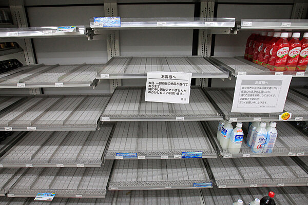 Shelves selling bottled water are empty at a convenience store in Tokyo on Wednesday, March 23. A spike in radiation levels in Tokyo tap water spurred new fears about food safety Wednesday as rising black smoke forced another evacuation of workers trying to stabilize Japan's radiation-leaking nuclear plant. -