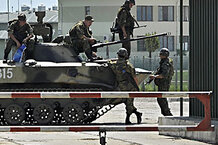 Russians manned the gate of a Georgian Army base they took over in the western town of Senaki last week. Though Russia has signed a cease-fire deal, it remains unclear when they will pull out. -