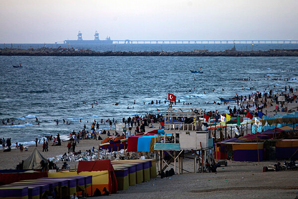 A Turkish flag flies on a mast as Palestinians enjoy the beach in Gaza City, Sunday. Iran is worried that Turkey is stealing the limelight on the Palestinian cause. So its Revolutionary Guard has offered to escort an Iranian Gaza flotilla. - About video ads