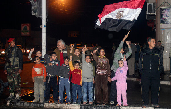 Palestinians wave an Egyptian flag in jubilation after receiving the news of Egyptian President Hosni Mubarak's resignation, as Hamas called for celebrations in Gaza City, Friday.