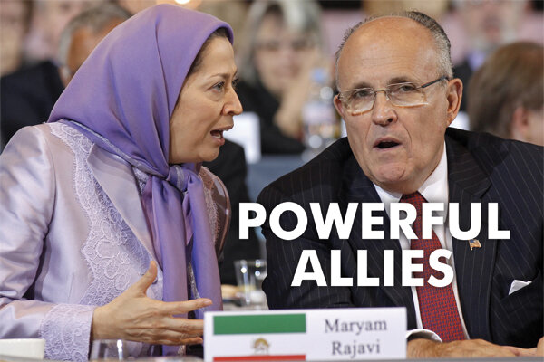The speaking events have created some extraordinary spectacles, including that of US heavyweights sharing the stage with the MEK's self-declared "president-elect" Maryam Rajavi. At a mid-June MEK rally in Paris, for example, Mrs. Rajavi was flanked by five rows of former top US and European officials. The noisy throng of thousands of well-orchestrated MEK supporters, draped in yellow vests and waving flags, banners, and balloons as clouds of confetti fell, looked like an American political convention.