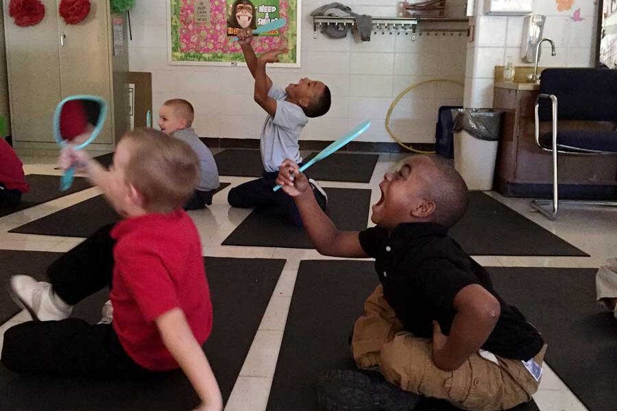 “We’re going to really try to keep our brains focused on the sound of the bell,” says Ms. Clem to a room of kindergartners sitting cross-legged on mats. “And when you can’t hear the bell anymore, I want you to look up and show me those beautiful smiles.”