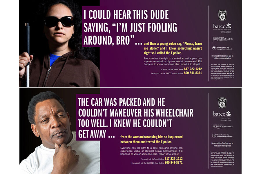 Those first signs of a shift are apparent in Boston, for example, where the public transportation system and a local rape crisis center have included people with disabilities in their public awareness campaign against harassment and sexual assault. Posters show how bystanders can protect the disabled, as well as how the disabled can help protect their fellow riders – akin to the See Something, Say Something security campaigns.