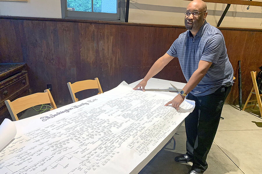 Mr. Baker’s jolt of elation – echoed today in the increasing number of African Americans engaging in ancestry searches through internet records and DNA testing – only seemed to grow in meaning over time as he made discovering his family’s past his life’s work. His painstakingly handwritten, 6-foot-long family tree of 11 generations and 1,000 descendants of enslaved people who labored at the Wessyngton tobacco plantation is his visualization of 40 years of sprawling research done for himself, for others seeking family information, for museums, and for his detailed book on the white Washington family and their slaves.
