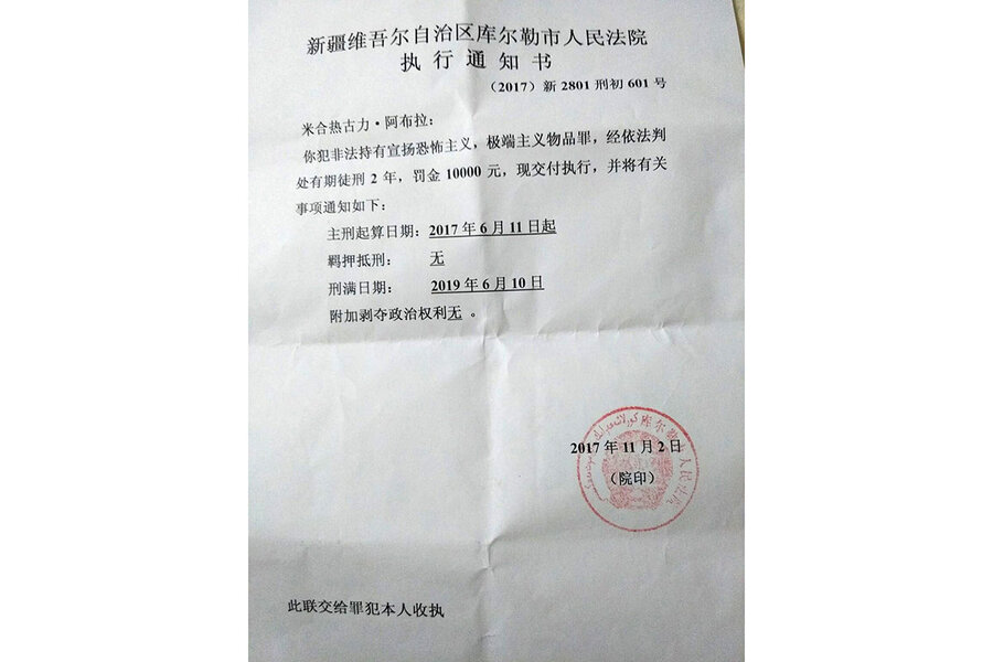 A court document reviewed by the Monitor says Ms. Abla possessed “materials propagating terrorism or extremism.” Mr. Mahsut was told that she simply had a digital copy of the Quran.