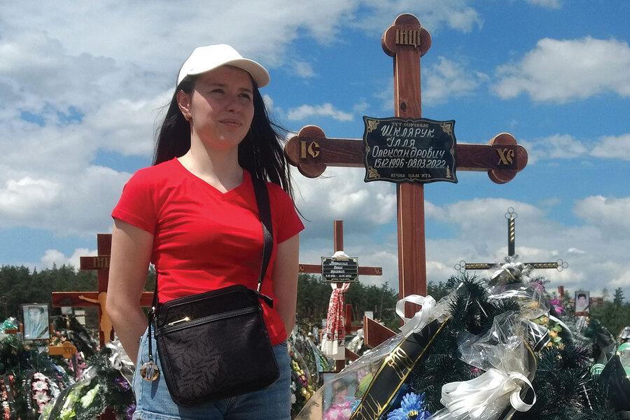 “This man did nothing and he was killed,” Ms. Shklyaruk says. Her voice, as impassive as her face, conveys the numb disbelief of the brokenhearted. She wears a baseball hat, jean shorts, and tennis shoes, and at age 21, she understands that war has cleaved her life. Before has turned into after, clarity into uncertainty. “What happened will never make sense. His own son will not remember him.”