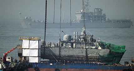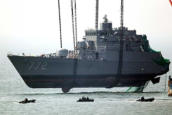 In this April 24 file photo, a giant offshore crane salvages the bow section of the South Korean naval Cheonan warship off Baengnyeong Island, South Korea. South Korea said Monday it froze funds for North Korea, ahead of Cheonan sinking report. - About video ads